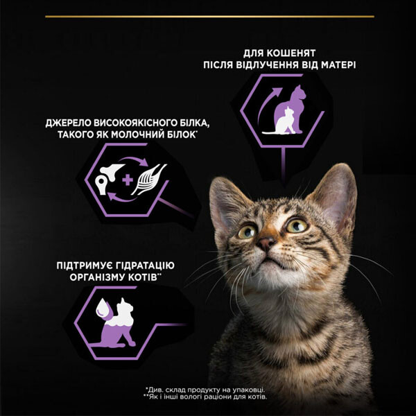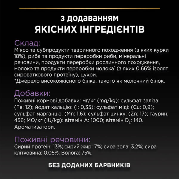 Повнораціонний вологий корм із куркою для кошенят віком від 6 тижнів до 1 року має збалансований раціон, що забезпечує організм котика необхідними поживними речовинами.